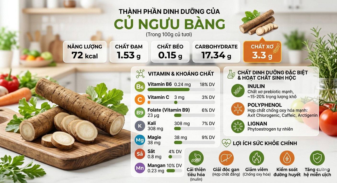 👉 Những thành phần này góp phần tạo nên nhiều công dụng ngưu bàng trong chăm sóc sức khỏe hàng ngày.